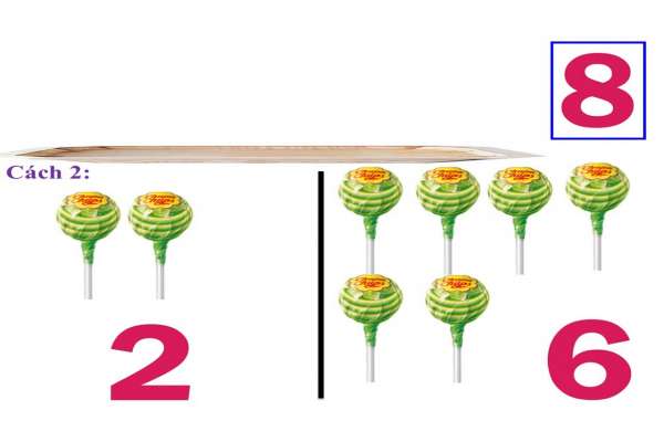 -Khi gộp 2 nhóm đối tượng trong phạm vi 8 với nhau thành 1 nhóm mới như số lượng ban đầu đã cho trước (là 8). Các con nhớ là 8 đối tượng đó được tách ra làm 2 phần bằng bao nhiêu cách thì khi gộp lại cũng có bấy nhiêu cách.