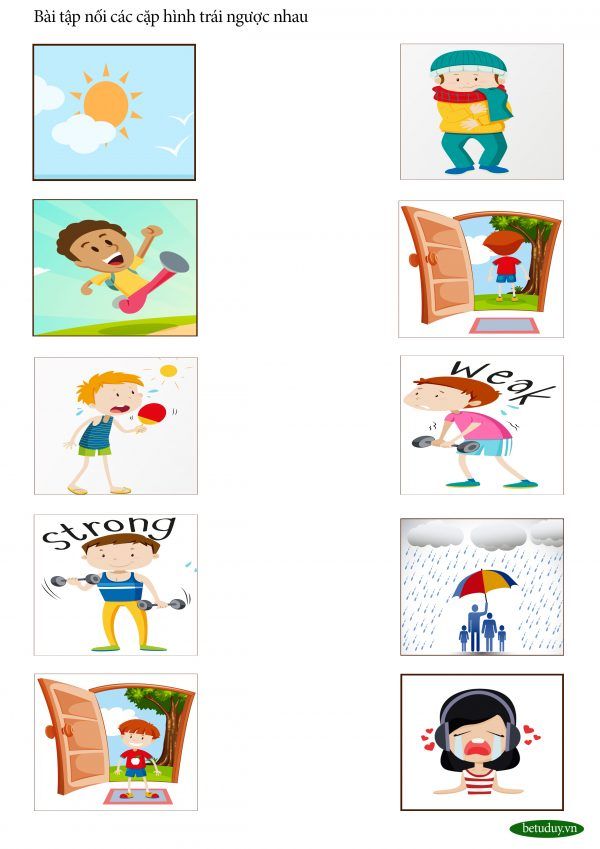 Bài tập nối đồ vật ở hai cột có mối liên quan giúp bé nhận biết được các vật cùng chung một nhóm hoặc có tác dụng như nhau. Phụ huynh có thể chuẩn bị những hình vẽ sẵn hoặc tự vẽ tạo thành hai cột. Bài luyện tư duy này rất tốt cho phản xạ của bé qua việc tập trung, nhìn và nhanh tay.