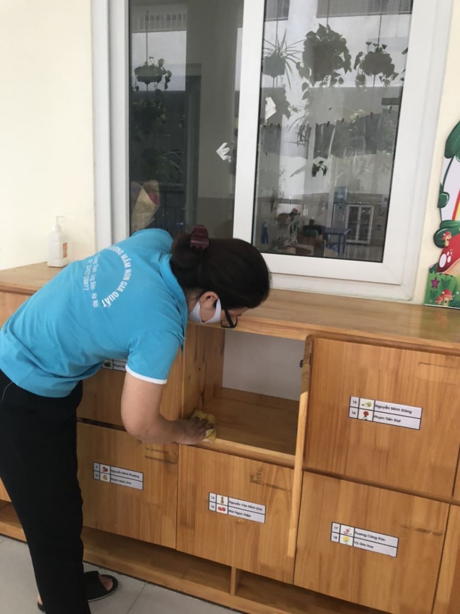 Thực hiện chỉ đạo từ các cấp lãnh đạo, mỗi người dân là một chiến sĩ trên mặt trận phòng chống dịch bệnh, các cô giáo khối mẫu giáo bé trường mầm non Gia Quất chung tay góp chút công sức bé nhỏ trong công cuộc phòng chống dịch bệnh thông qua việc hàng ngày dọn dẹp vệ sinh môi trường lớp học, vệ sinh đồ dùng đồ chơi của trẻ để mang lại một môi trường giáo dục sạch sẽ, an toàn, đảm bảo thoáng mát trong những ngày hè cho các con học sinh thân yêu.