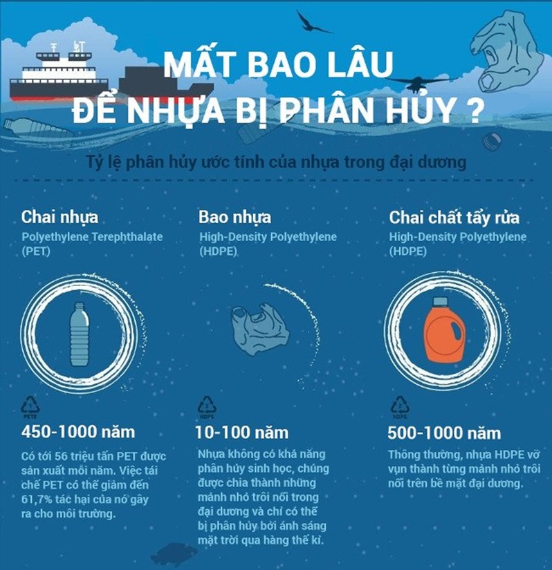 Infographic sau đây sẽ cho chúng ta biết các loại rác thải nhựa được hình thành từ đâu và vòng đời của chúng kéo dài bao lâu.