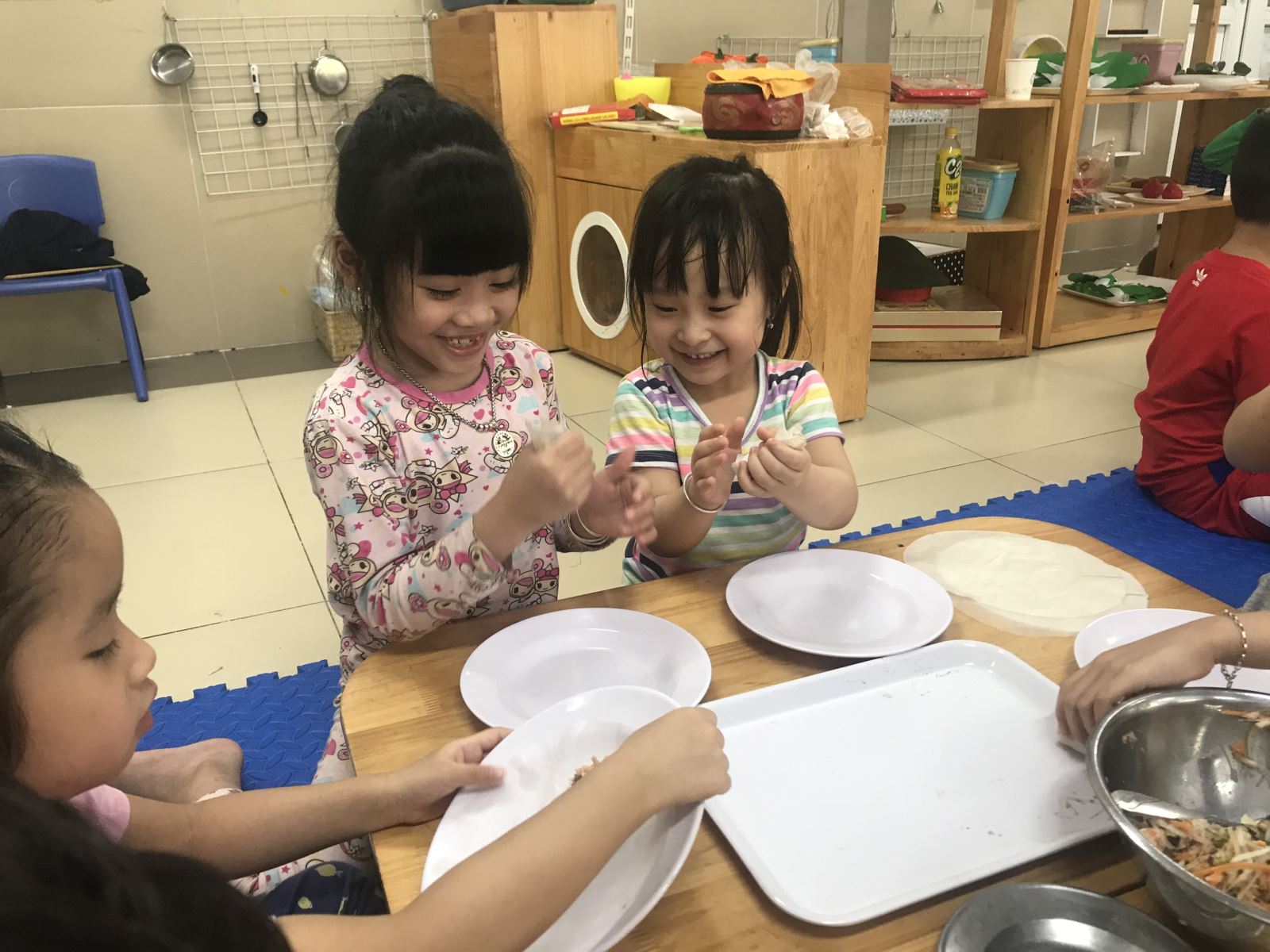 Nem rán luôn là một món ăn ngon và hấp dẫn đối với mỗi gia đình. Tuy nhiên để gói được những cái nem đều, đẹp thì lại cần có sự khéo léo về cách gói. Để hướng dẫn các bé kỹ năng gói nem đều, gọn các cô giáo lớp mẫu giáo lớn A1 trường mầm non Gia Quất đã cho các bé trải nghiệm, thực hành hoạt động bé tập làm nội trợ với các kỹ năng như: xúc, trộn, gói…. Các bé vô cùng thích thú chuẩn bị các nguyên liệu cùng với cô giáo của mình như:nạo su hào, cà rốt, cắt miến, hành, giá..…. Ở buổi thực hành các bé được các cô giới thiệu về các nguyên liệu cần có để làm nem, cách sơ chế các nguyên liệu, trộn các nguyên liệu cùng các loại gia vị sao cho vừa và ngon, đặc biệt là cách gói nem thật khéo léo và cẩn thận đó là cách trải bánh đa ra, cho nhân vào, gấp 2 mép bánh đa lại và cuộn kín thì sẽ được một chiếc nem thật đẹp. Với đôi bàn tay nhỏ bé khéo léo, cùng với sự hướng dẫn tỉ mỉ của cô giáo các con đã mạnh dạn, tự tin gói được những cái nem thật đều, đẹp rồi. Sau đó các bác nhà bếp đã rán những chiếc nem mà các bé vừa gói để các bé được thưởng thức sản phẩm do tự mình làm ra. Thấy các con vui vẻ, tự tin háo hức tham gia vào các hoạt động các cô cũng thấy vui với niềm vui của các con. Các cô giáo mong rằng, các con hãy thể hiện sự khéo léo của mình trong việc giúp bà, giúp mẹ những công việc nội trợ . Chúc các con luôn là những đứa con ngoan, là niềm vui của bà, của mẹ và các cô giáo nhé!