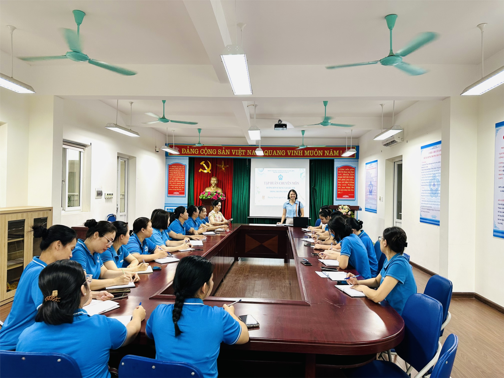 Với sự truyền đạt của đ/c Dương Thị Minh Ngọc- Phó HT phụ trách chuyên môn, 100% các đ/c giáo viên đã có nhận thức sâu hơn về giá trị, tác dụng của việc cho trẻ sử dụng vật liệu rời đối với trẻ mầm non. Từ đó, các đ/c sẽ có những biện pháp để thực hiện hiệu quả nội dung đã được tập huấn trong năm học tới.Cuối buổi tập huấn, đ/c Nguyễn Ngọc Anh - Hiệu trưởng nhà trường cũng có những chỉ đạo sát sao để các nội dung tập huấn được lan tỏa và nâng cao công tác giáo dục của nhà trường.