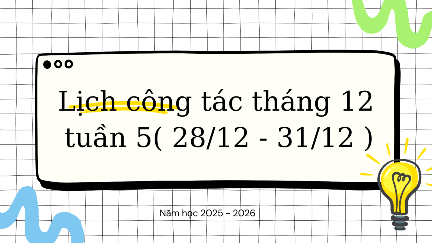 | 3 | Dương Thị Minh Ngọc | S | - Giao nhận TP - Kiểm tra thể dục sáng - Hỗ trợ đón trẻ D3 - Họp giao ban BGH | - Giao nhận TP - Chỉ đạo công tác trang trí chuẩn bị cho chương trình chào năm mới 2026 - Họp thi đua khen thưởng | - Giao nhận TP -Kiểm tra công tác đón trẻ khối MGB - Kiểm tra trang website - Hoàn thiện hồ sơ KTNB tháng 12/2025 | Nghỉ lễ | Nghỉ lễ | Nghỉ lễ |
