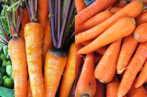 Cà rốt Đà Lạt (bên trái) da sần, màu cam nhạt, cuống lá còn nguyên, vị ngọt thanh tự nhiên, hiện có giá 22.000 đồng một kg. Ngược lại, cà rốt Trung Quốc (bên phải) da bóng láng, củ to, tròn đều, không cuống, màu cam đậm, vị nhạt, giá 15.000 đồng một kg.