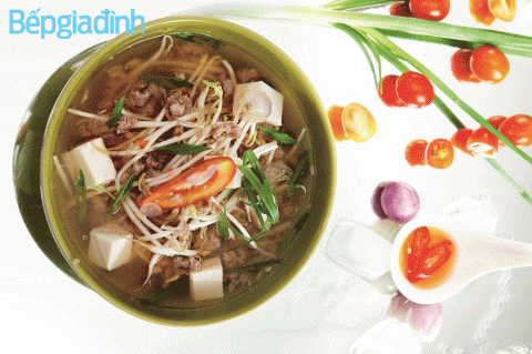 – Dầu nóng, cho hành vào đảo thơm, thêm thịt và cà chua vào xào nhừ, cho nước vào nấu sôi, thả đậu hũ vào nêm gia vị vừa ăn. Sau cùng cho giá, hành lá vào tắt lửa.