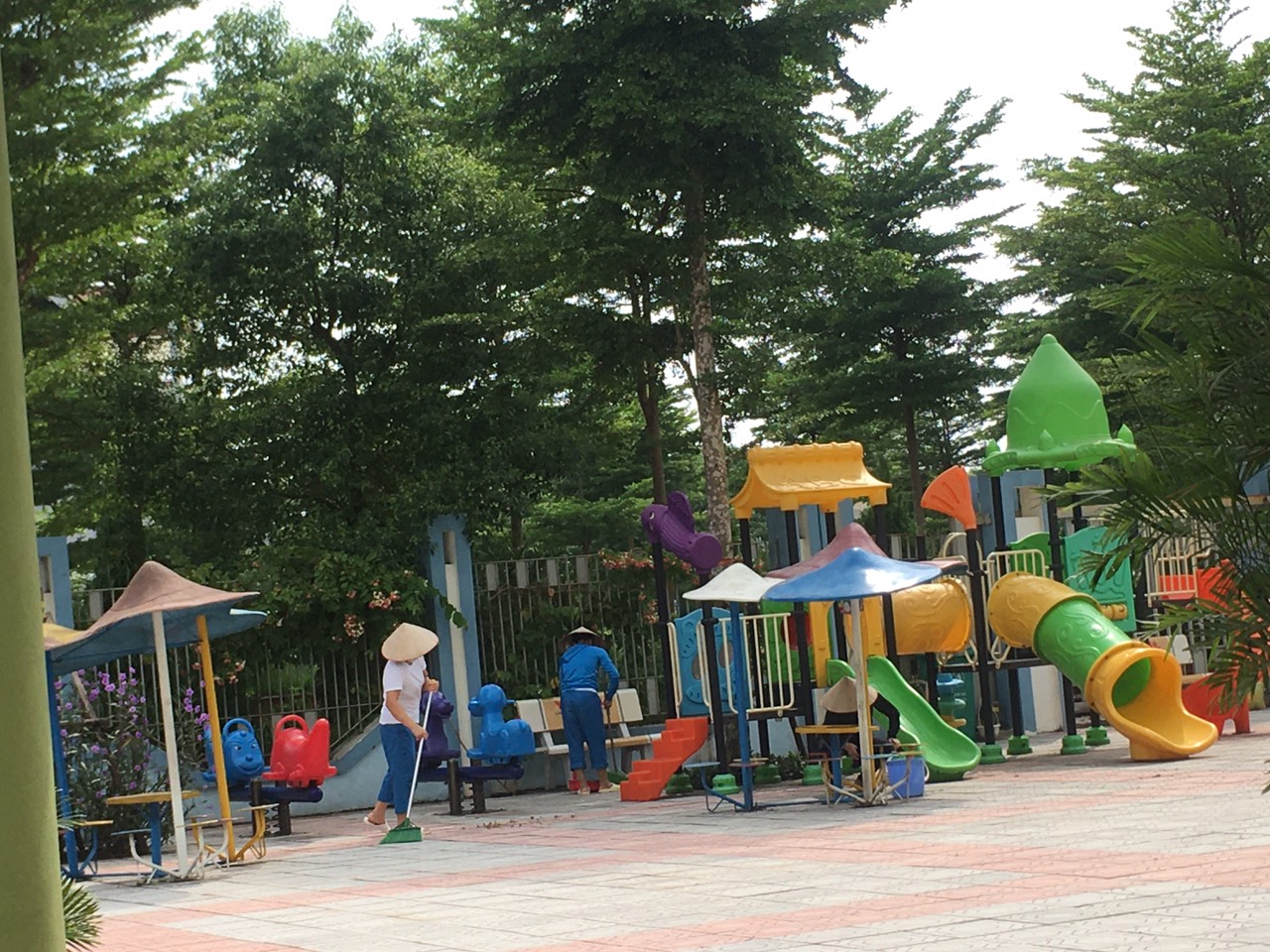 Các cô đang tích cực quét , vệ sinh sạch sẽ sân trường cho các bé vui chơi!