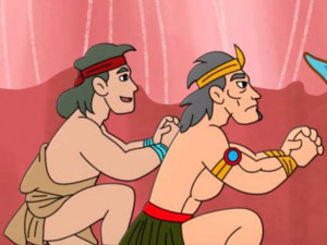 Một hôm có hai chàng trai đến, xin ra mắt nhà vua để cầu hôn. Một người ở vùng núi Ba Vì, tuấn tú và tài giỏi khác thường: chỉ tay về phía đông, phía đông biến thành đồng lúa xanh, chỉ tay về phía tây, phía tây mọc lên hàng dãy núi cao. Nhân dân trong vùng gọi chàng là Sơn Tinh. Còn một người ở mãi tận miền biển Đông tài giỏi cũng không kém: gọi gió gió đến, hò mưa tới – Chàng này tên gọi là Thủy Tinh.